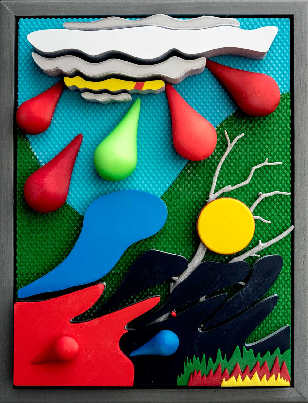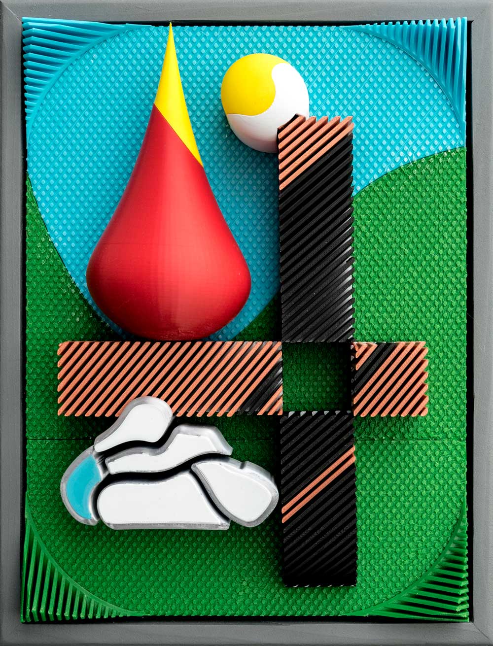 Die zentrale Symbolik wird plastisch – transformiert durch 3D-Druck in reliefartige Oberflächen und frei stehende Skulpturen.